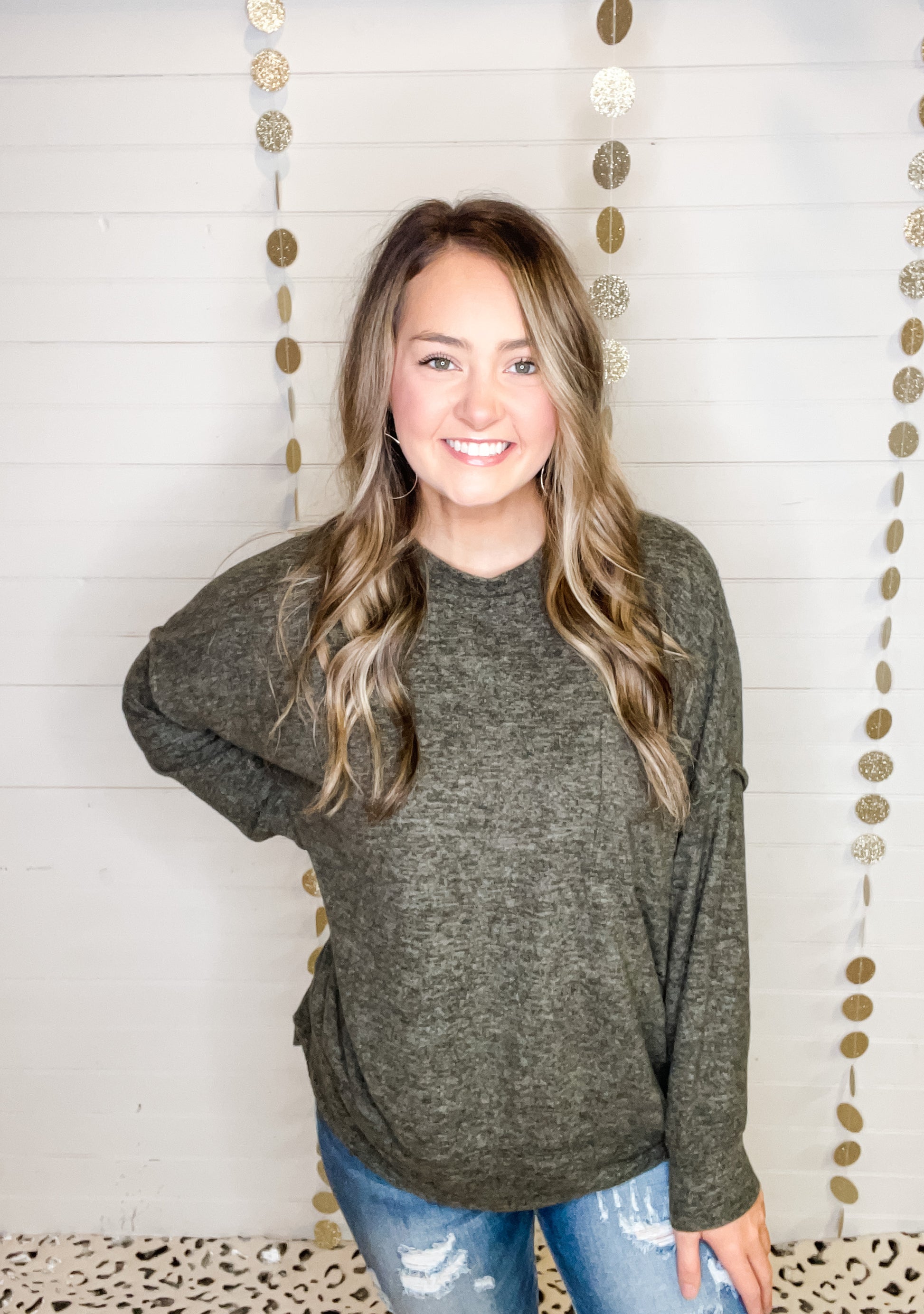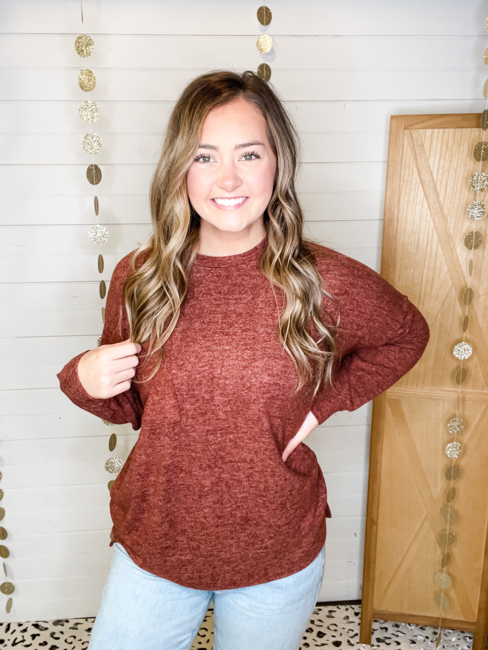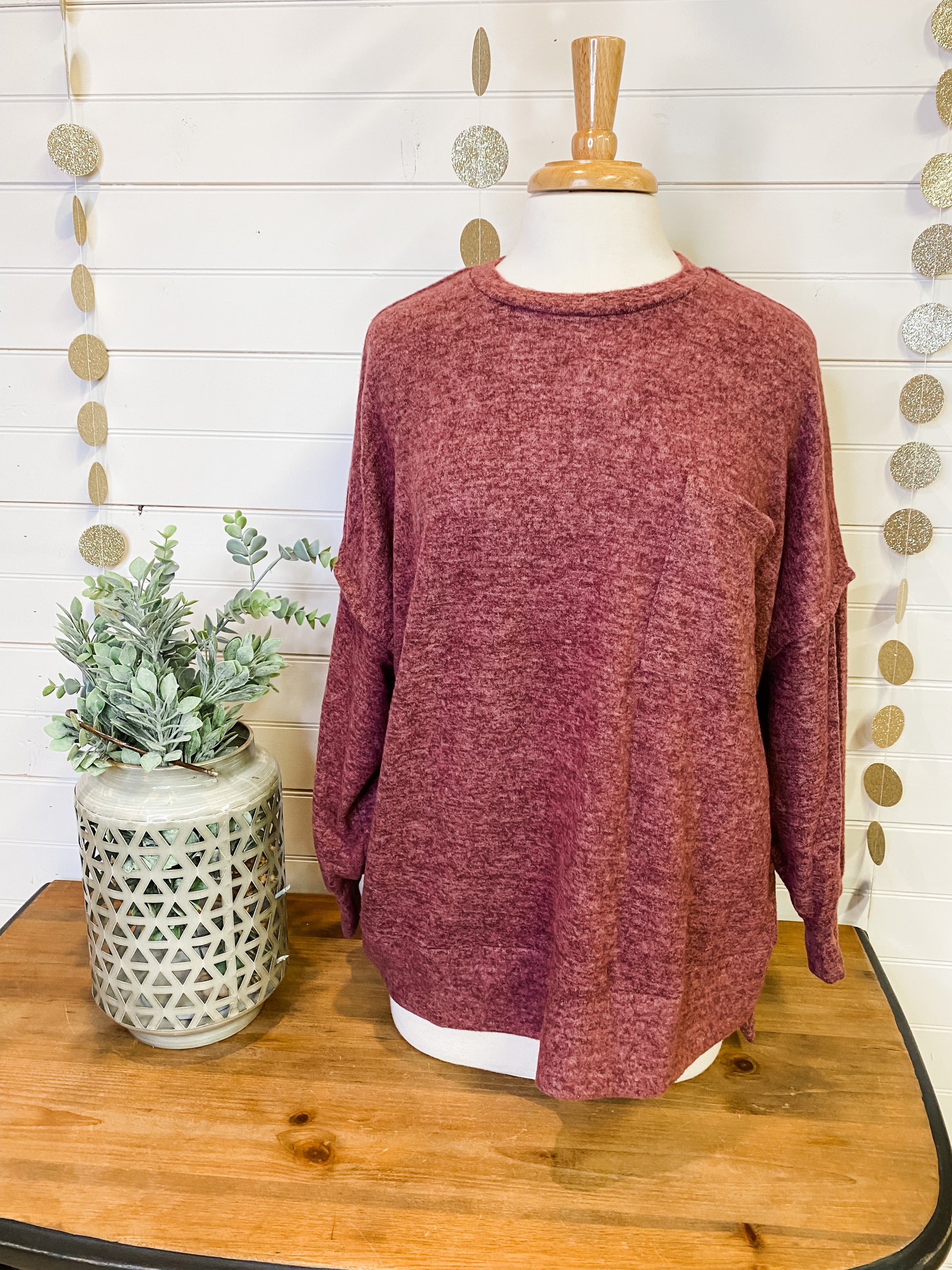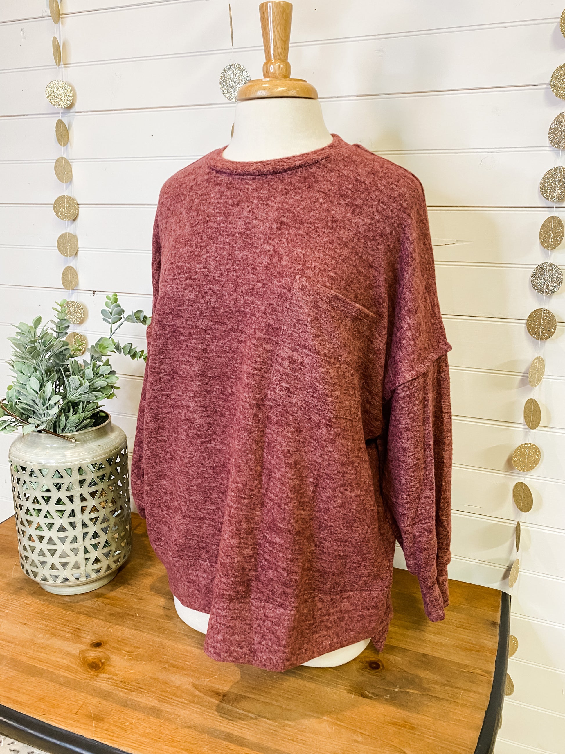 A brushed mélange drop shoulder oversized sweater with seam accents on sleeve and back with hi-low hem, flat chest pocket and soft fabric.