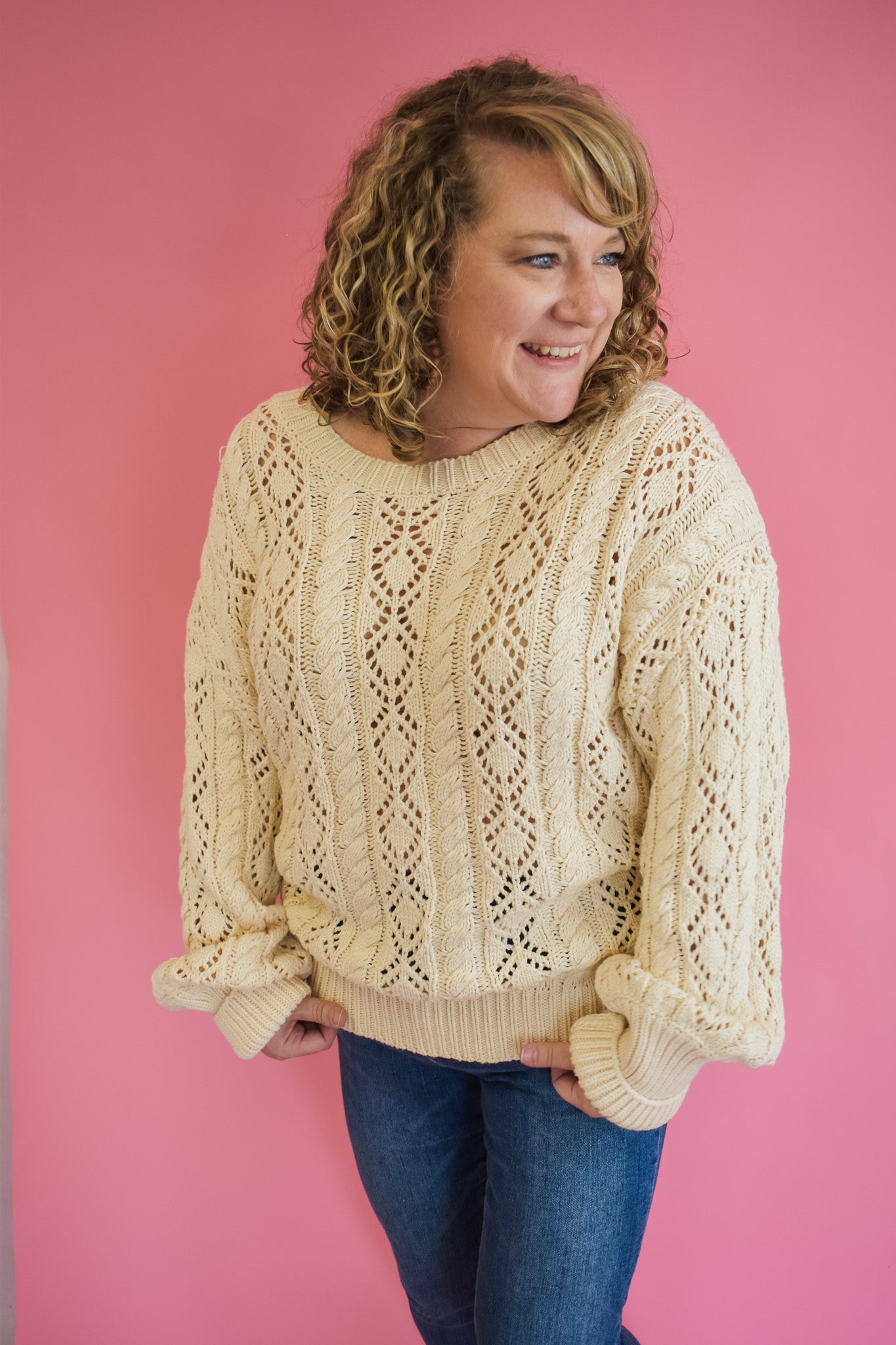 This is our Crochet Bubble Sleeve Sweater, and it is GORGEOUS! It is a solid cable knit sweater, has a boat neck and long cuff bubble sleeves, and a ribbed neck and hem. It is a loose/relaxed fit.