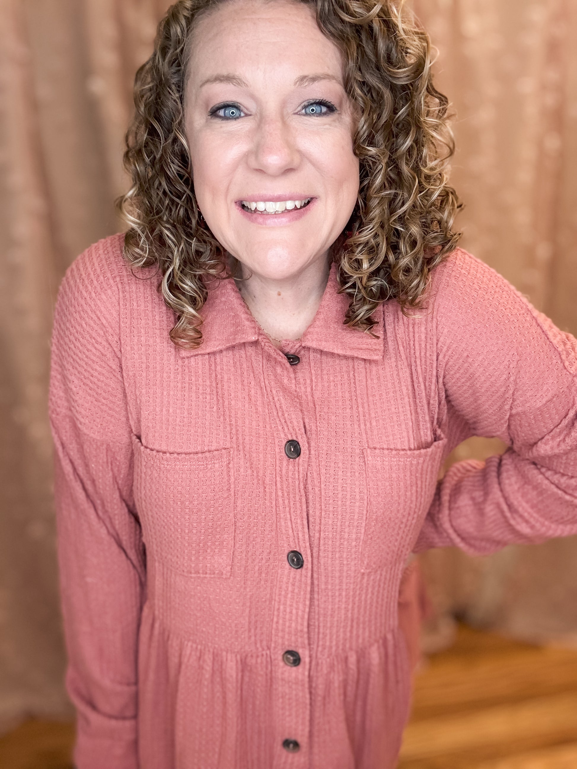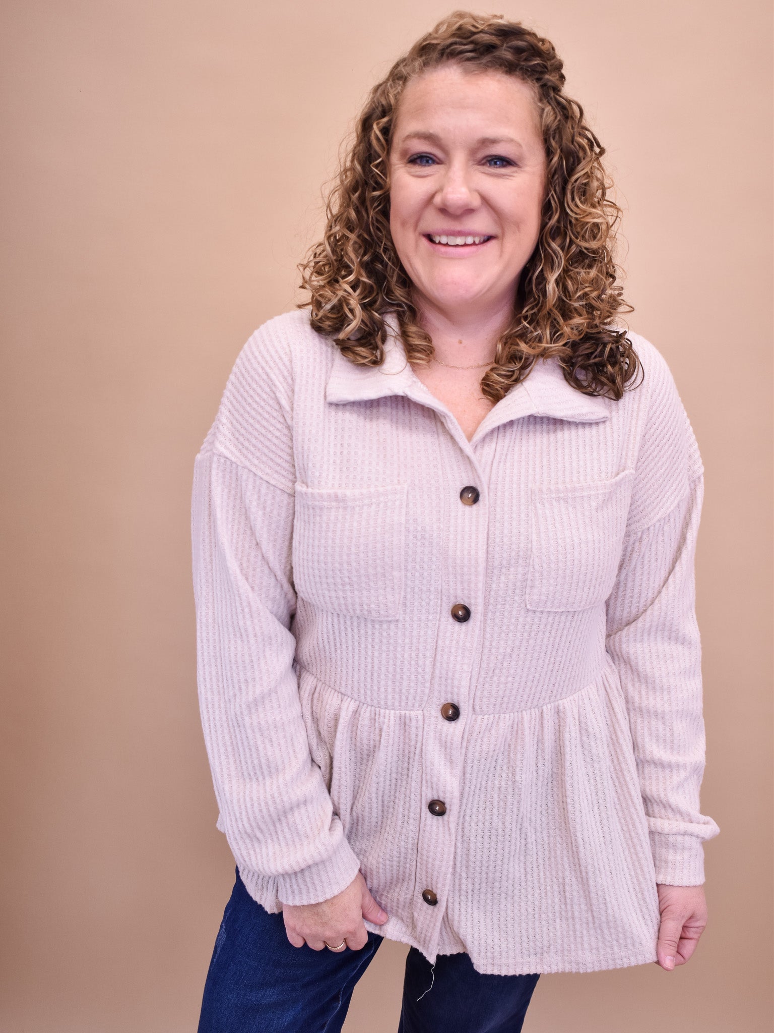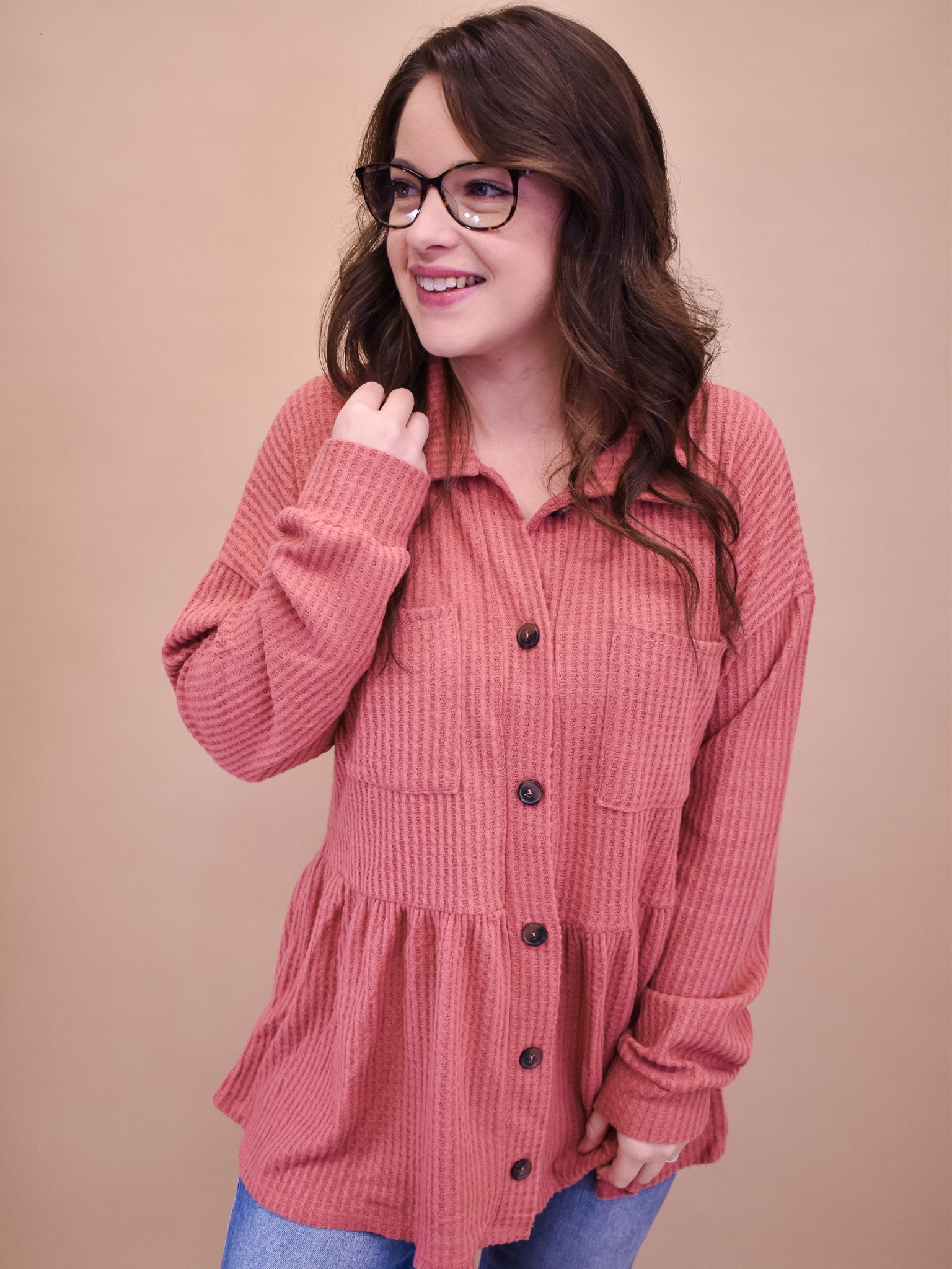 Introducing the Feel It All Waffle Button Down Top! This solid shacket features a stylish front pocket and shirring detail. With the perfect combination of comfort and style, feel confident and unstoppable in this versatile piece.