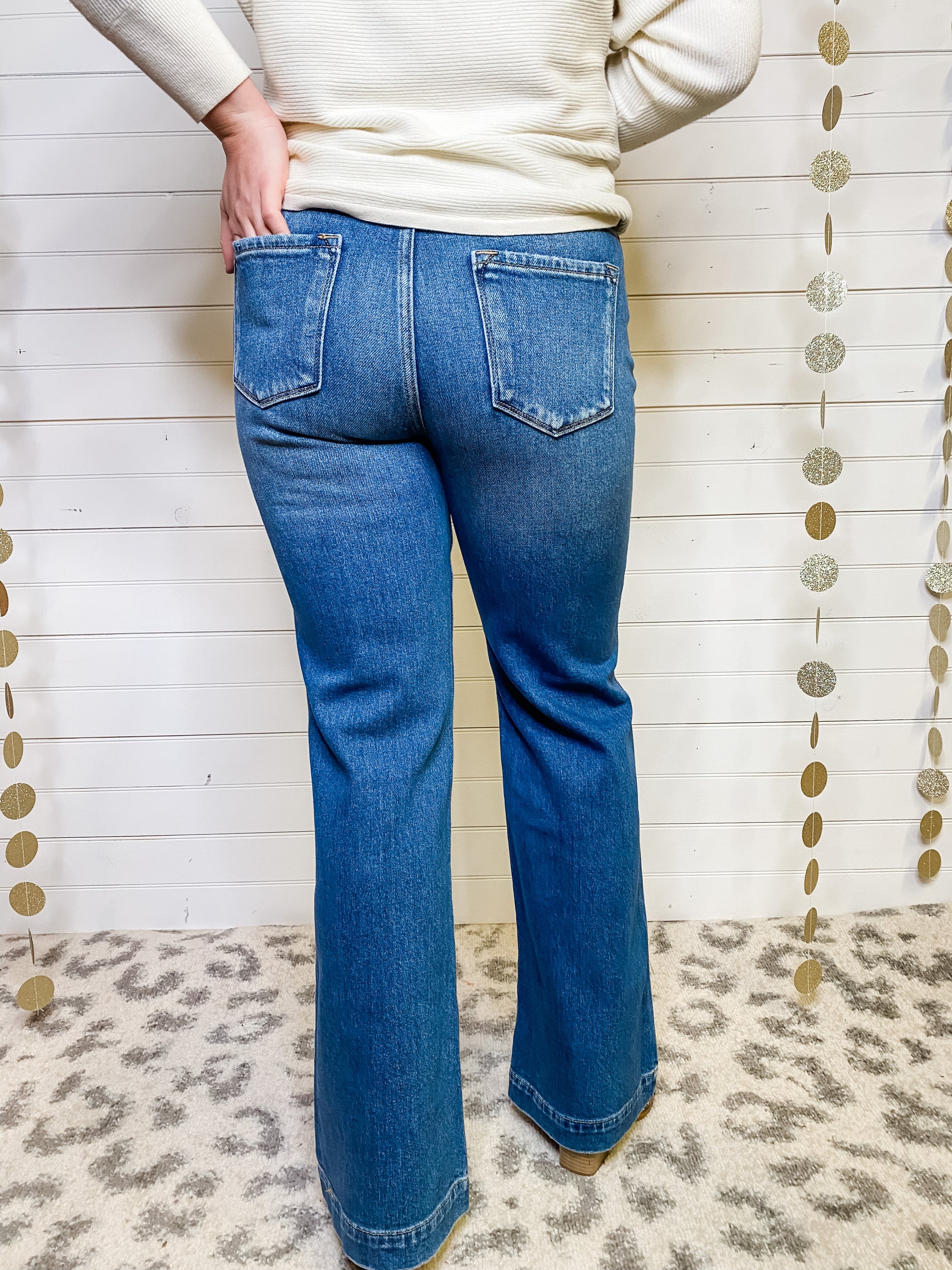 These are our high rise holly flares. They have a comfortable stretch, double belt loops, and cut seam at front pockets. Check out our sizing info below!