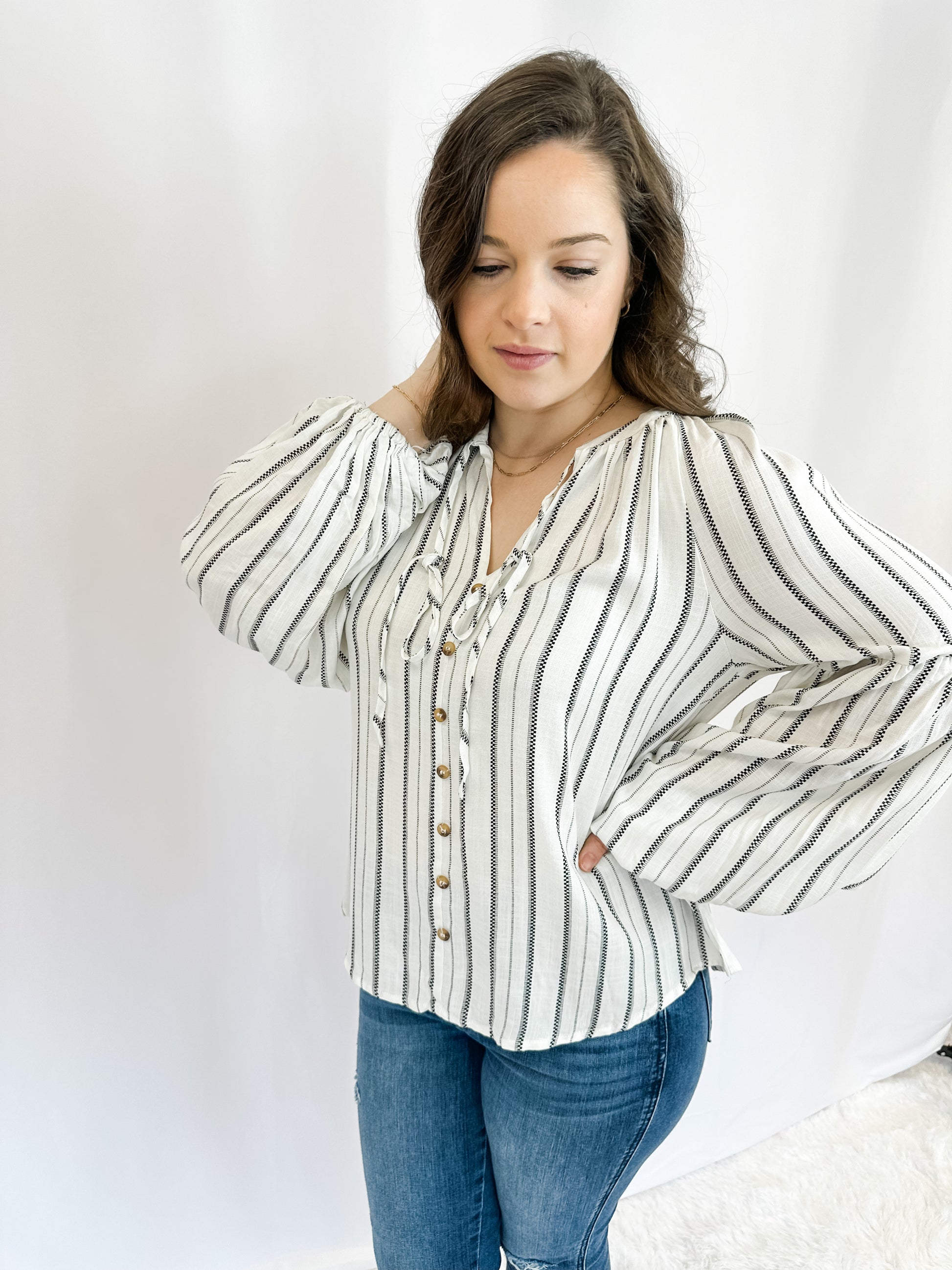 Our In My Element Stripe Top is the perfect way to add a timeless appeal to any wardrobe! Crafted from lightweight cotton, this unique top features a striking stripe pattern, button detail, and tie strings to create an eye-catching, feminine look. Step out in confidence and feel absolutely beautiful in this stunning piece!