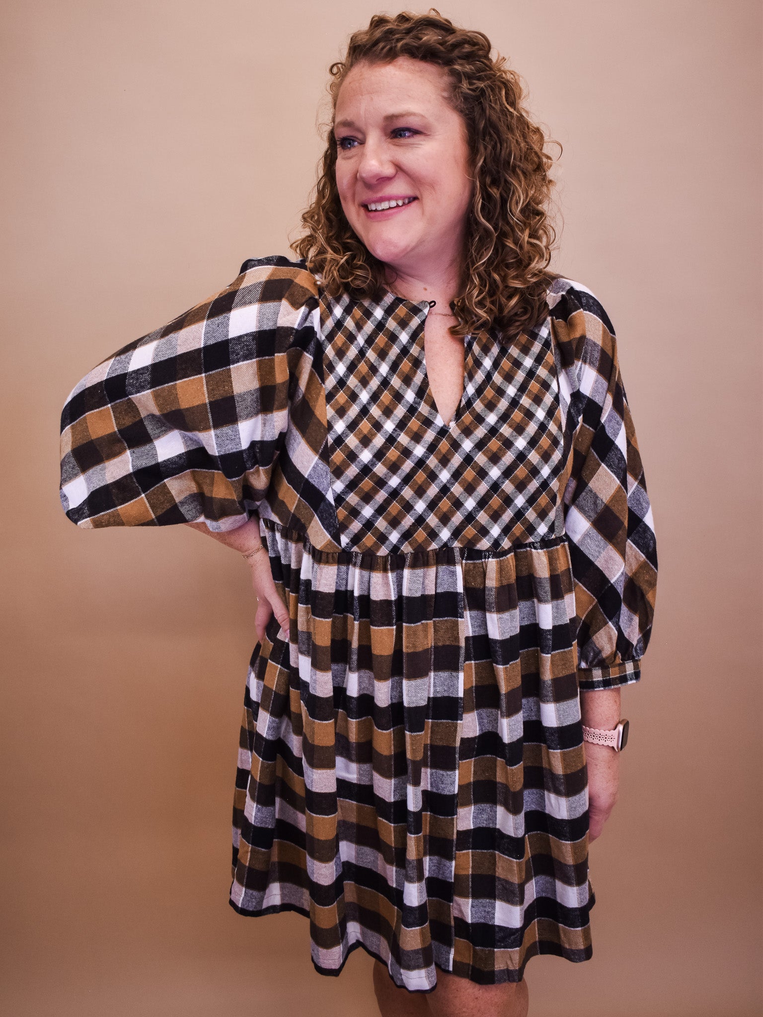 Indulge in effortless style with our In The Mix Plaid Babydoll Dress! This stunning dress features a striking contrast plaid design, 3/4 sleeves for a touch of charm, and a front button keyhole for added flair. Step out in confidence and make a statement in this must-have dress.
