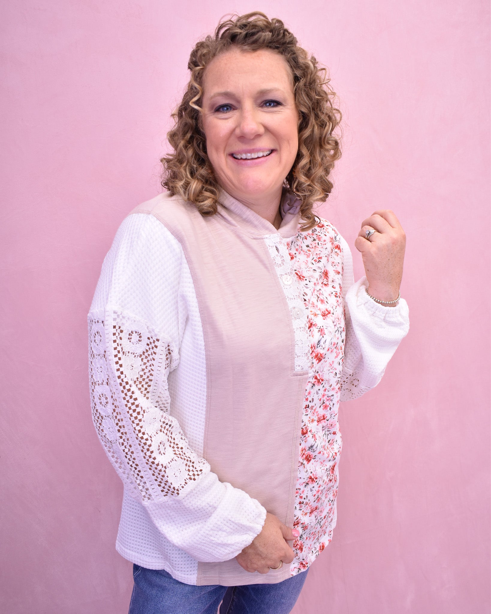 Brighten your wardrobe with the Kind Smile Mix Texture Patchwork Top, featuring a playful blend of lace and floral fabrics in a charming patchwork design. The cozy hood and classic Henley neckline add casual comfort with a creative twist, making it perfect for adding a cheerful touch to any outfit.