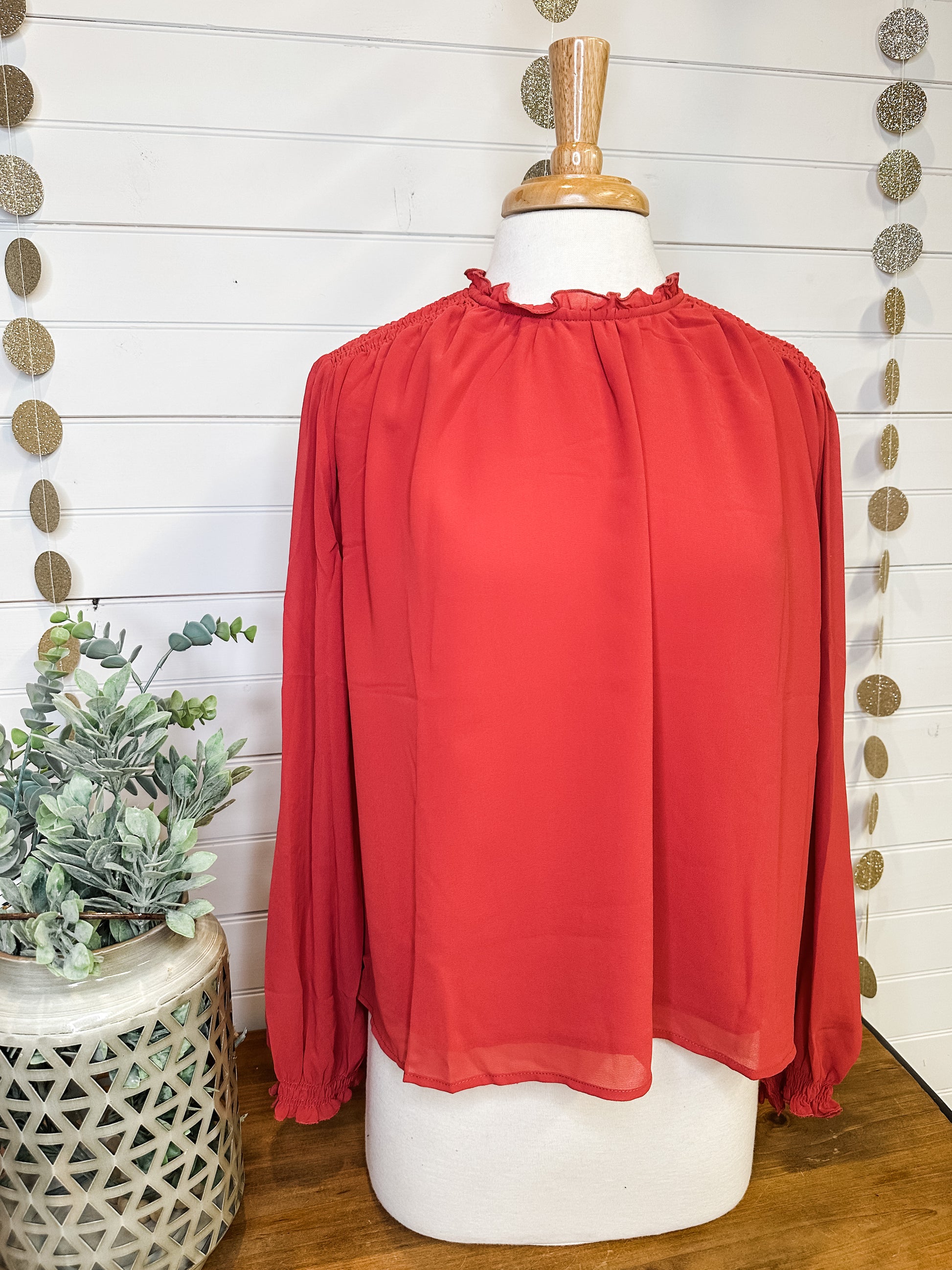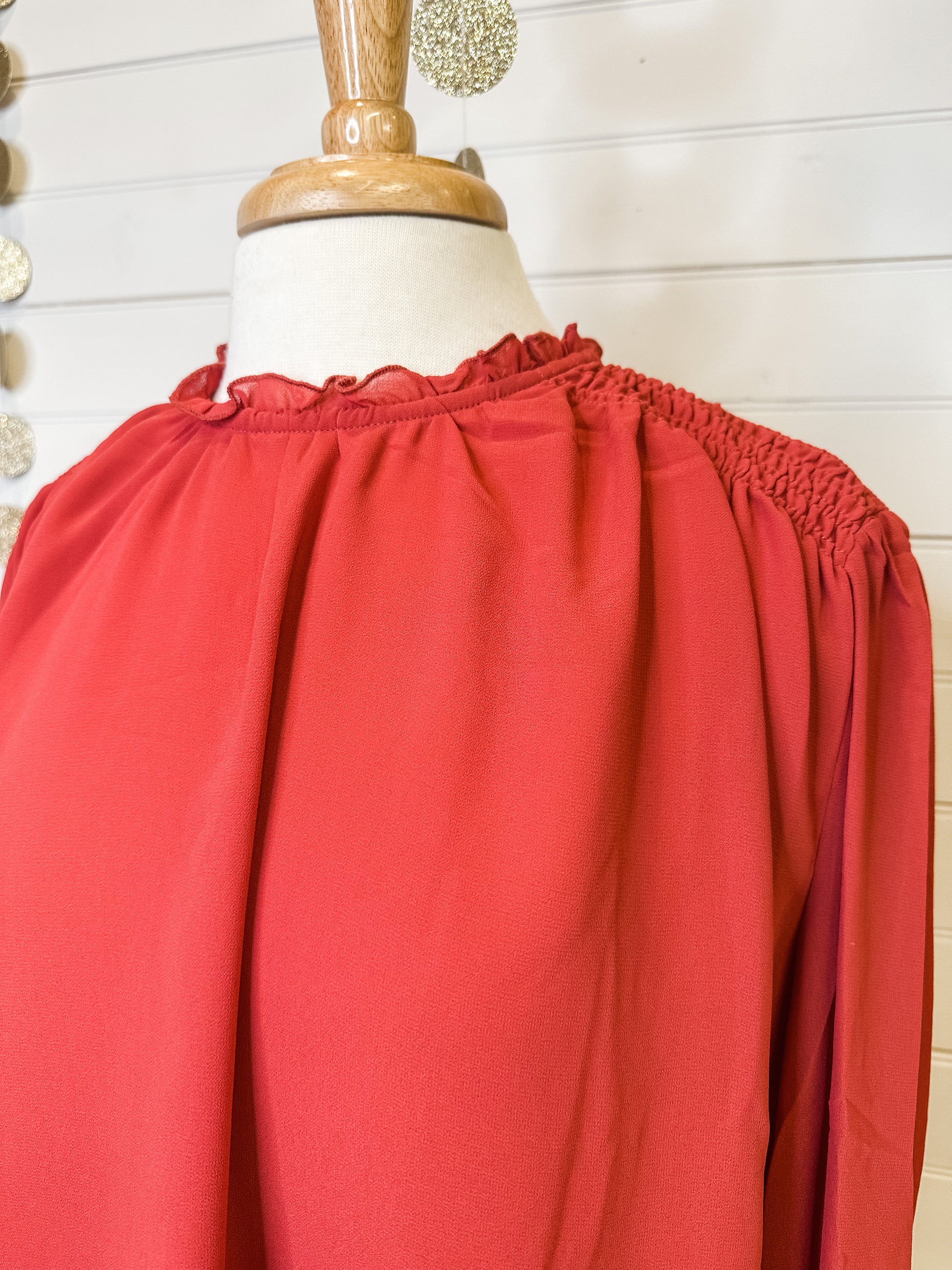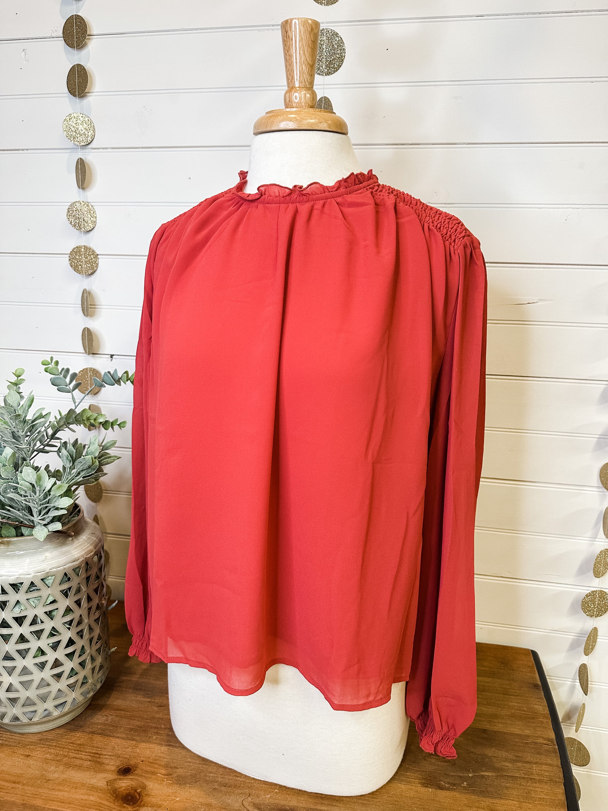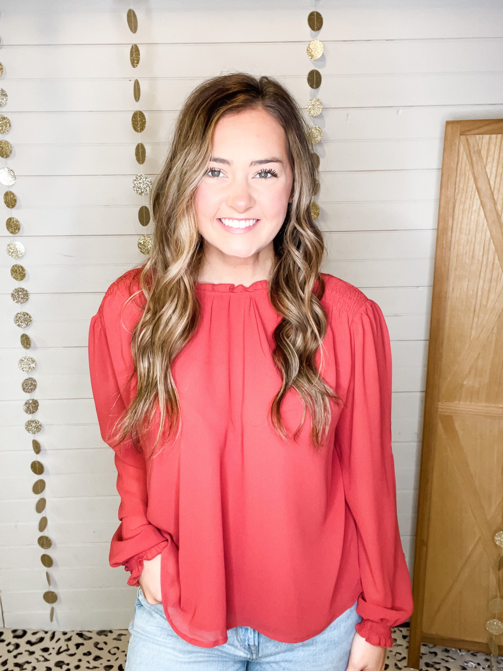 Our Lead Me There Top features a smocking detail on the shoulders and around the wrist, with a button closure in the back. This top is perfect if you are looking for a dressy or workwear look!