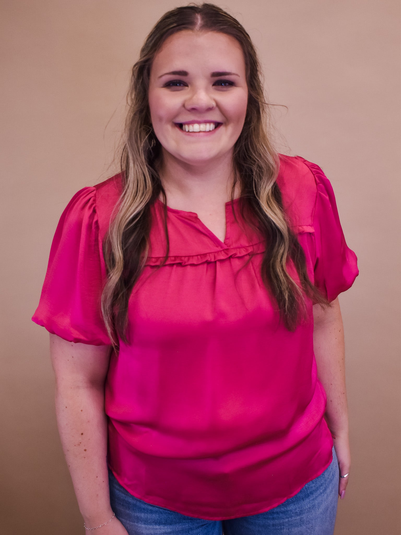 The Making Magic Satin Top is a beautiful fashion statement. Crafted from silky satin, it features a ruffled yoke, and puff sleeves for a timelessly chic look. Perfect for day or evening wear, this top will make you look and feel magical.
