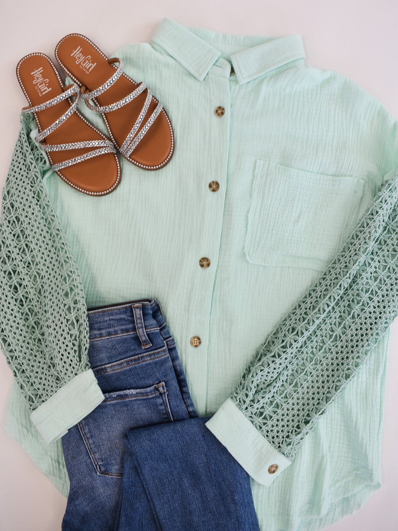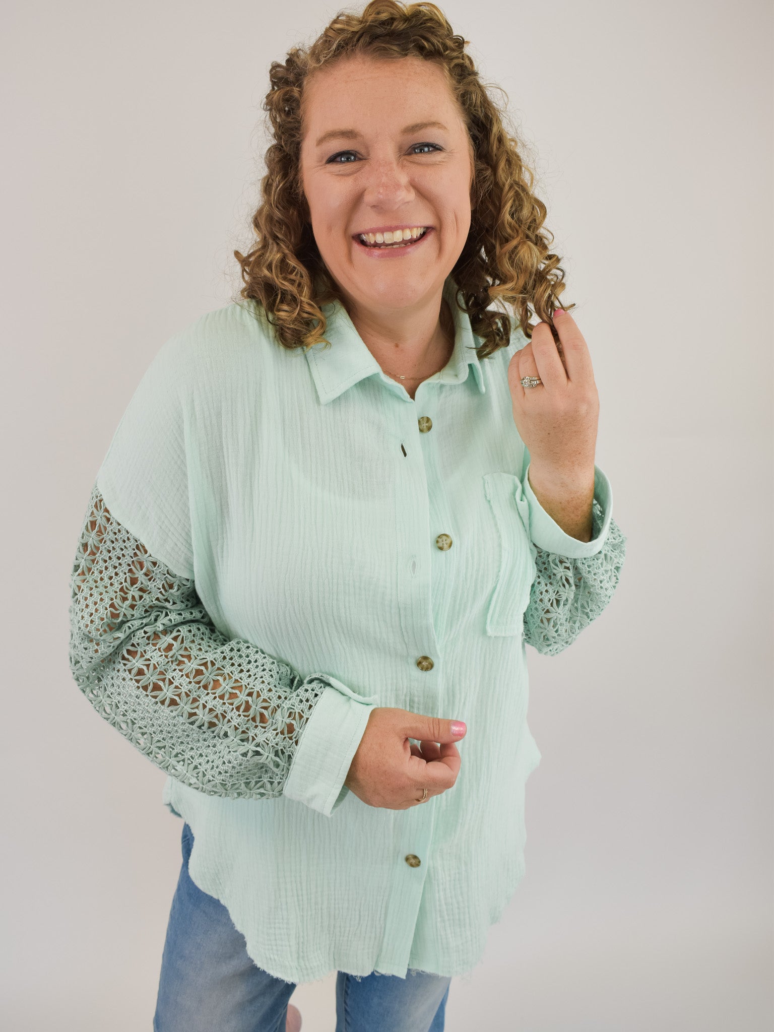 Unleash your inner boho with our Need A Little Lace Button Up Top! Featuring a classic button up design and delicate crochet lace sleeves, this top adds a touch of whimsy to any outfit. Perfect for a carefree, laid-back style.