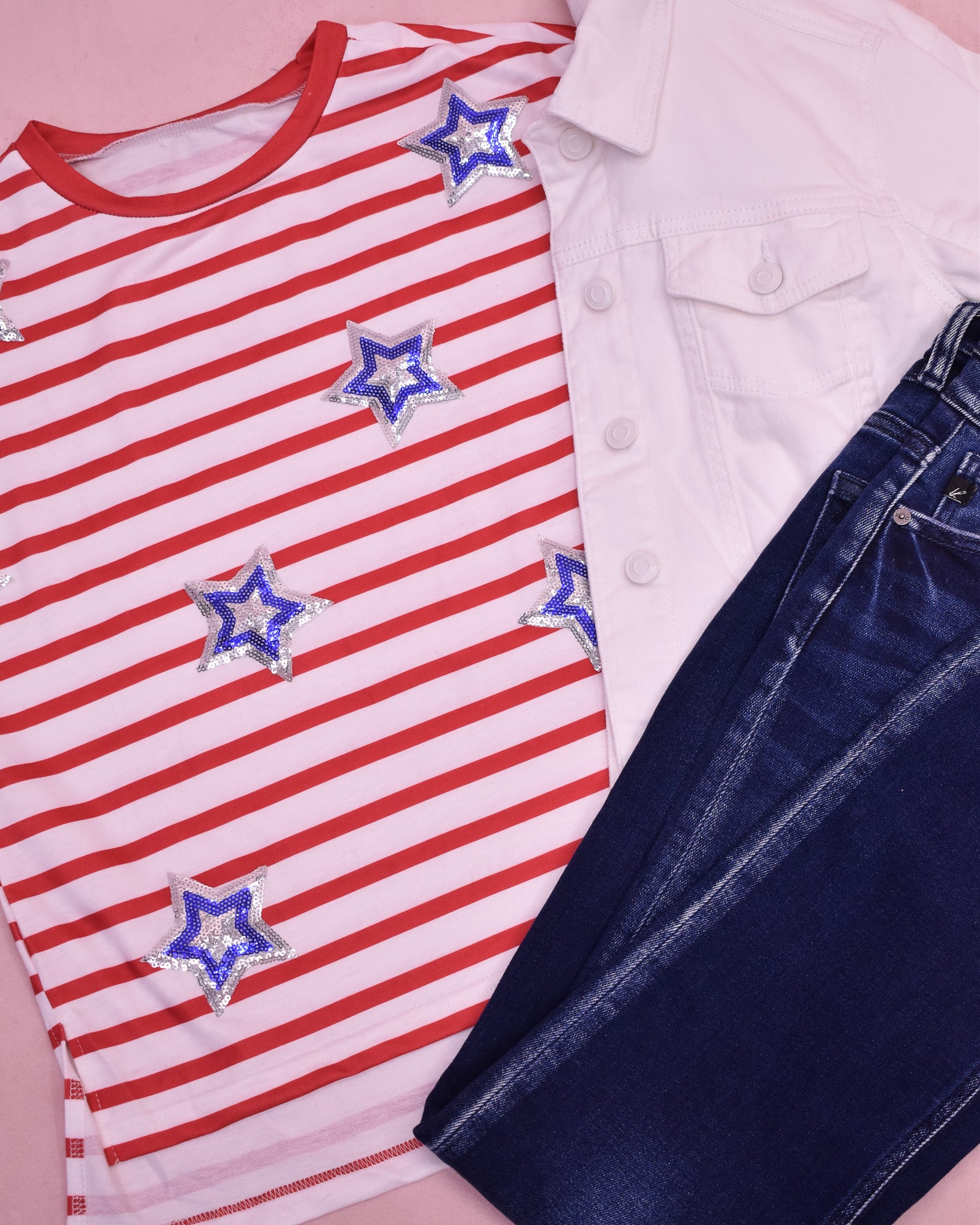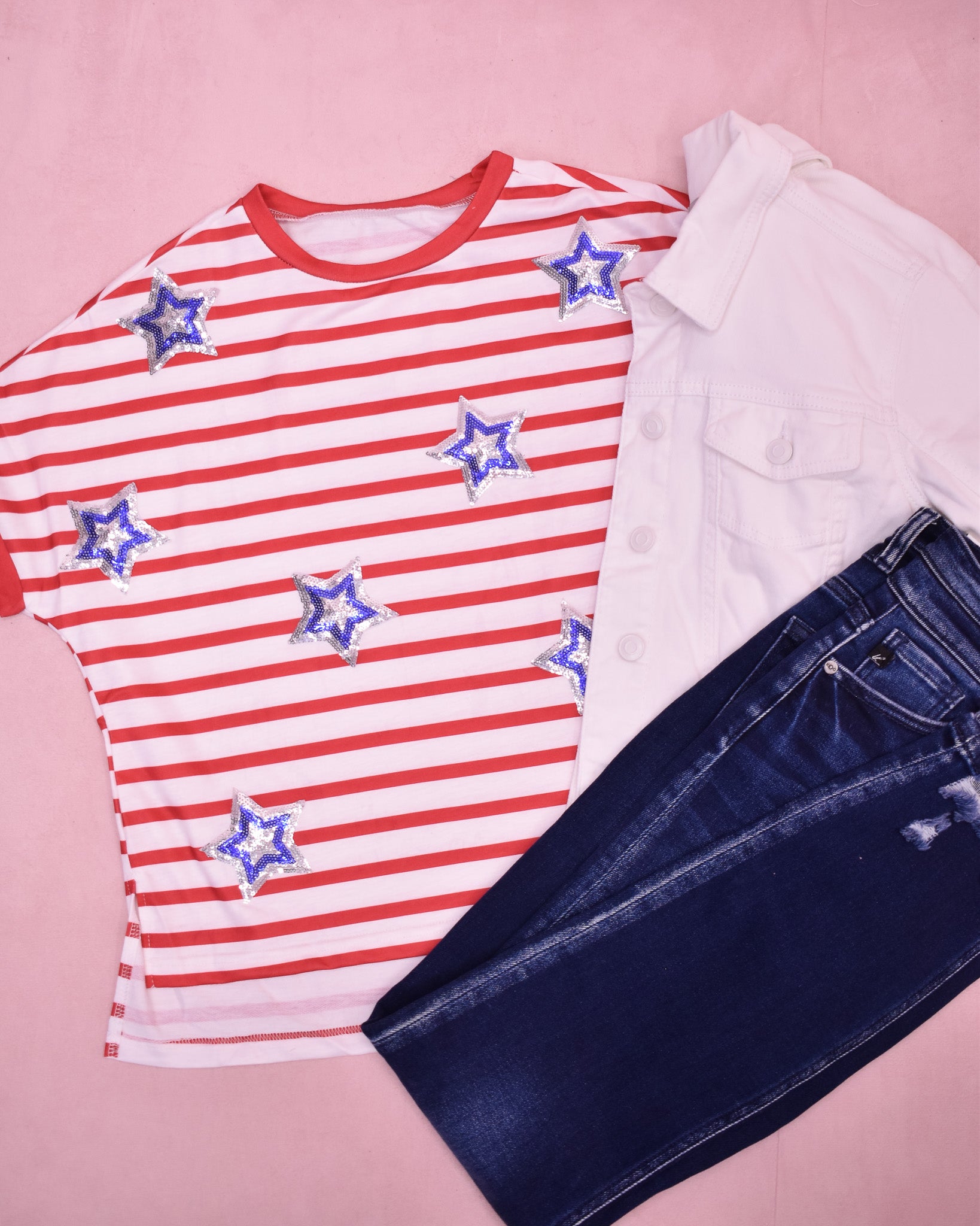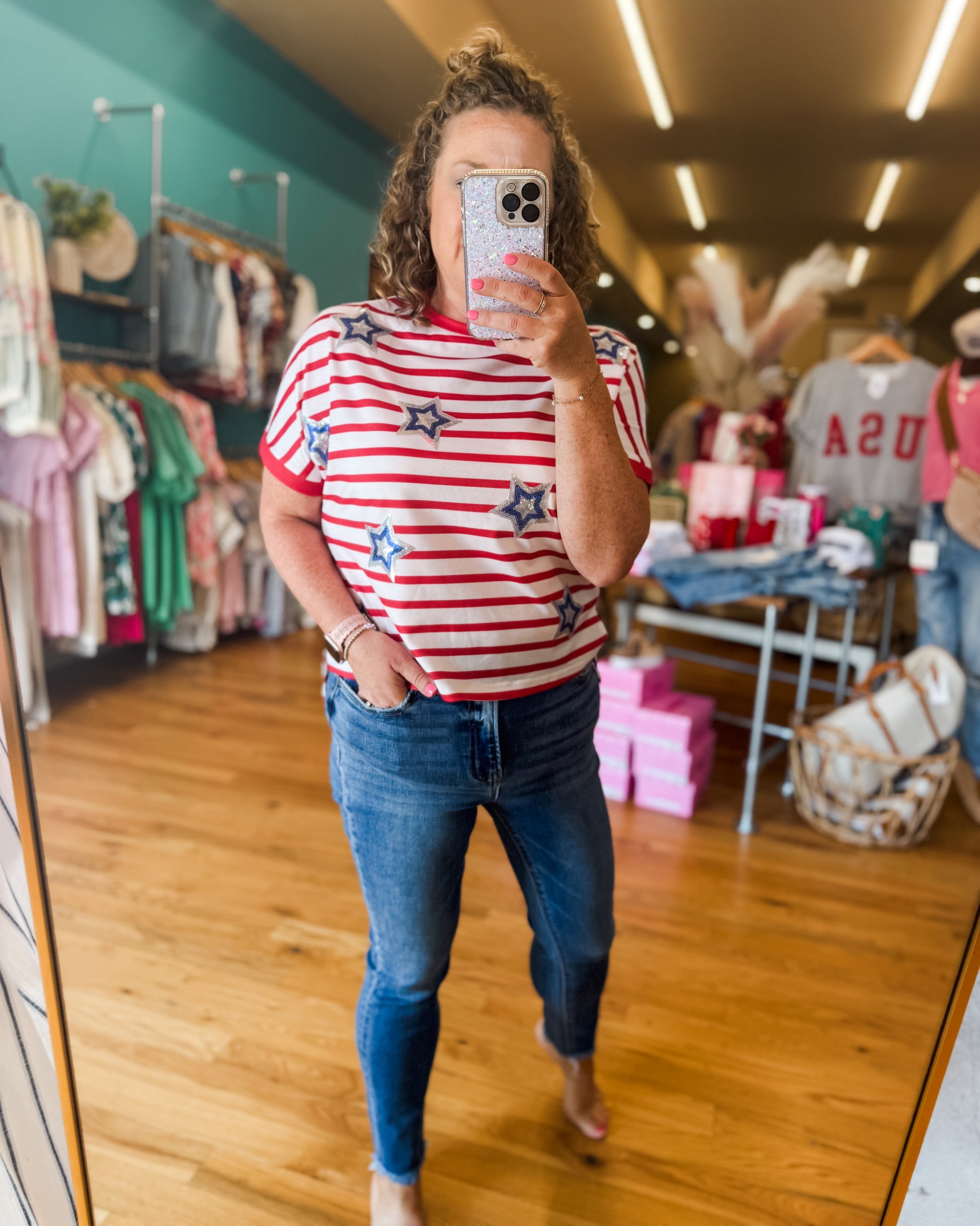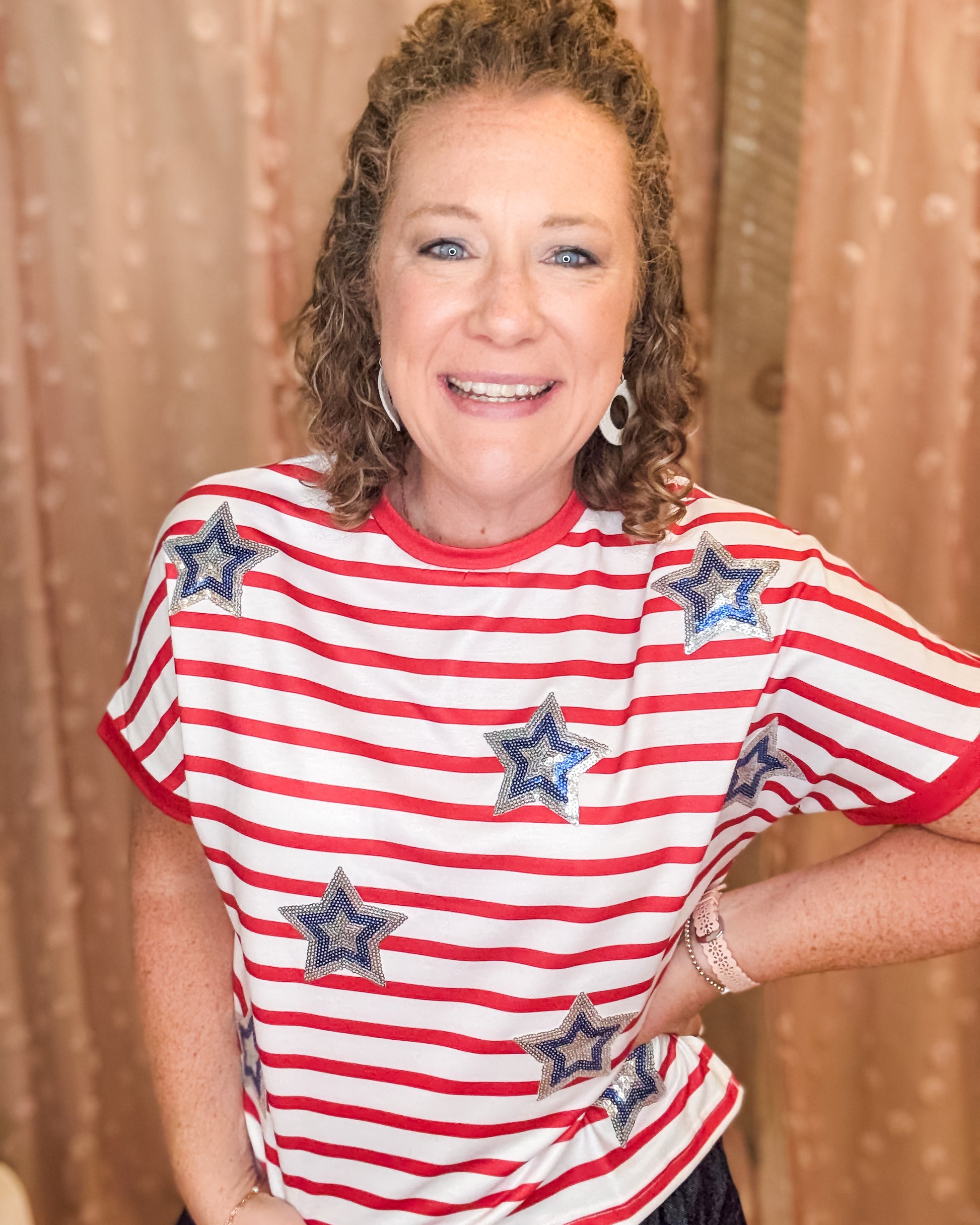 Celebrate your patriotic spirit with our Shine Bright Sequin Star Top, featuring bold striped sequin star patches inspired by the flag. This comfortable t-shirt blends festive flair with everyday wearability, making it perfect for showing your pride at national holidays or casual outings. Shine bright and express your love for your country in style.