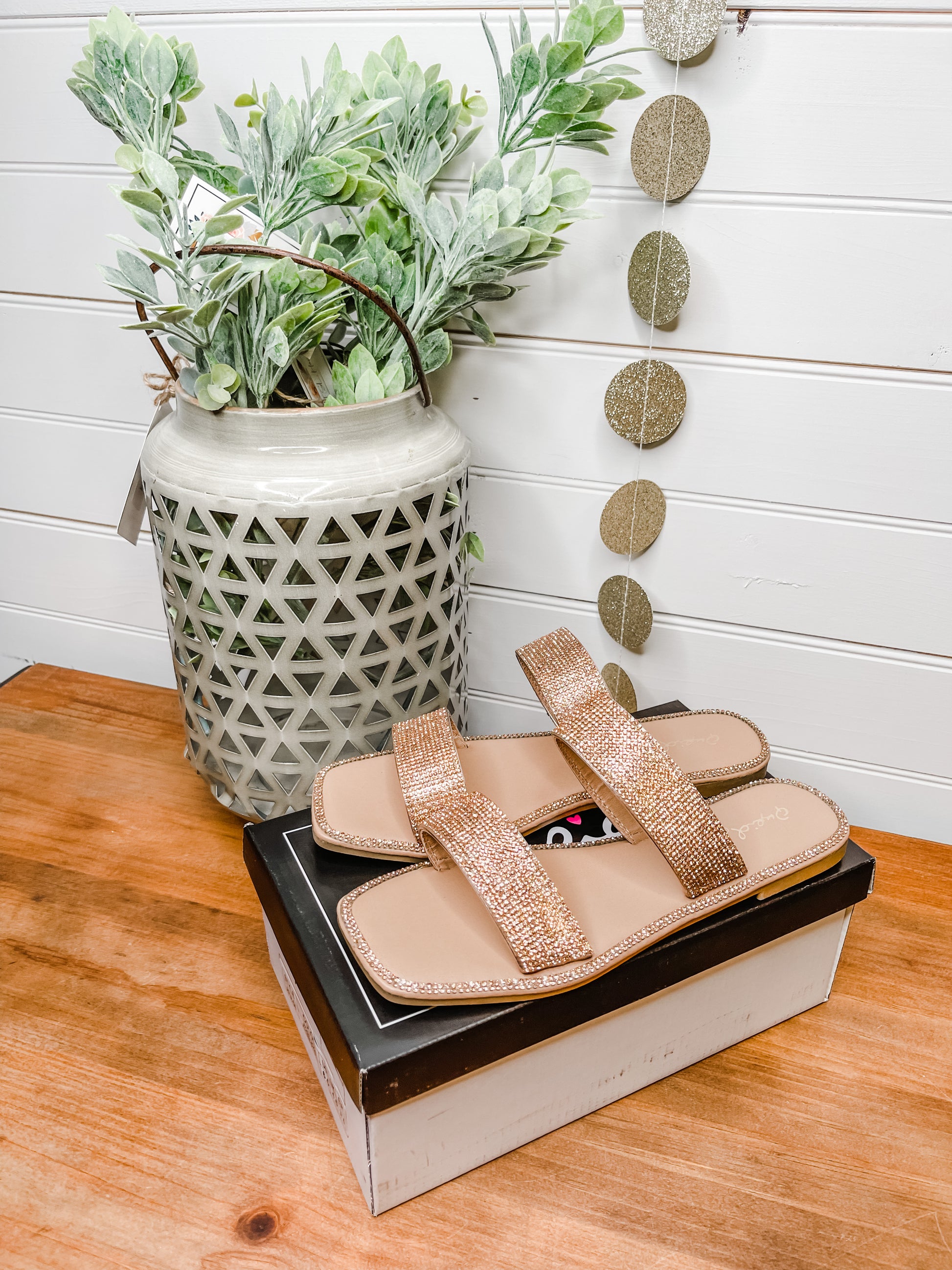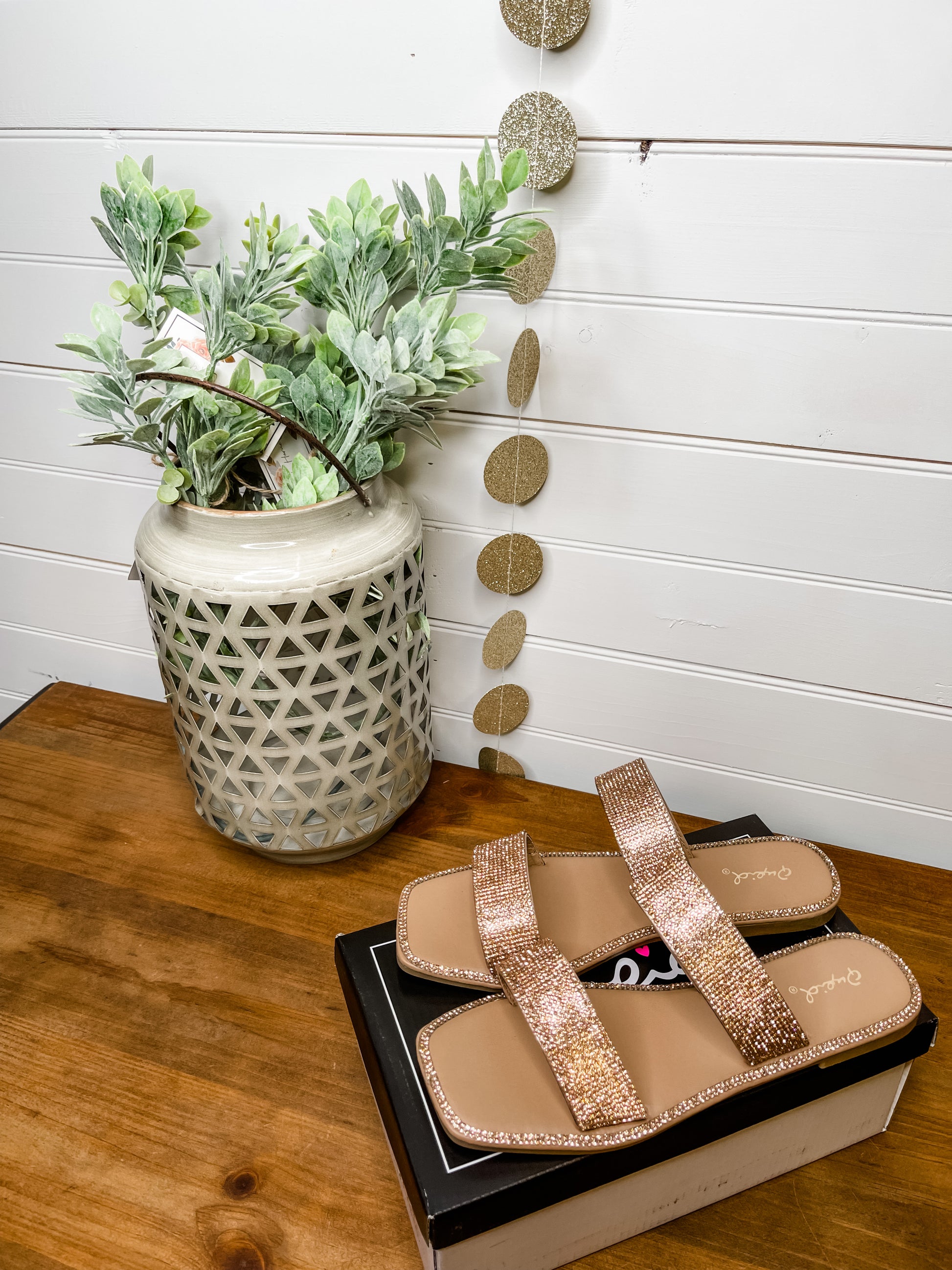 These are our Rhinestone Strappy Sandals, and they are so pretty! We love the "bling" that you get with these. Slide these on super easy for all day wear with your favorite dresses, skirts, denim, capris, or shorts! Seriously, you can pair these with almost anything!
