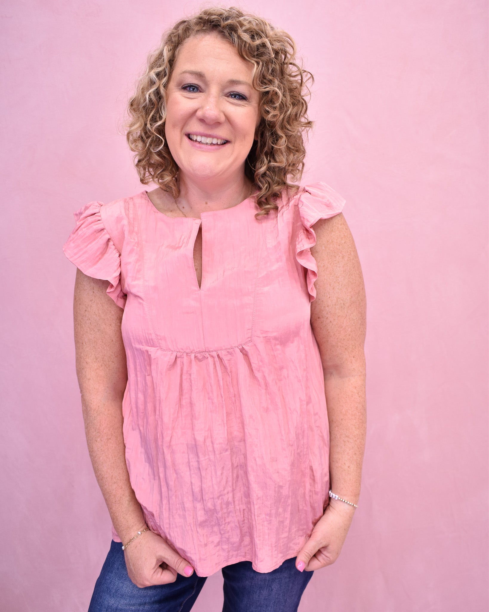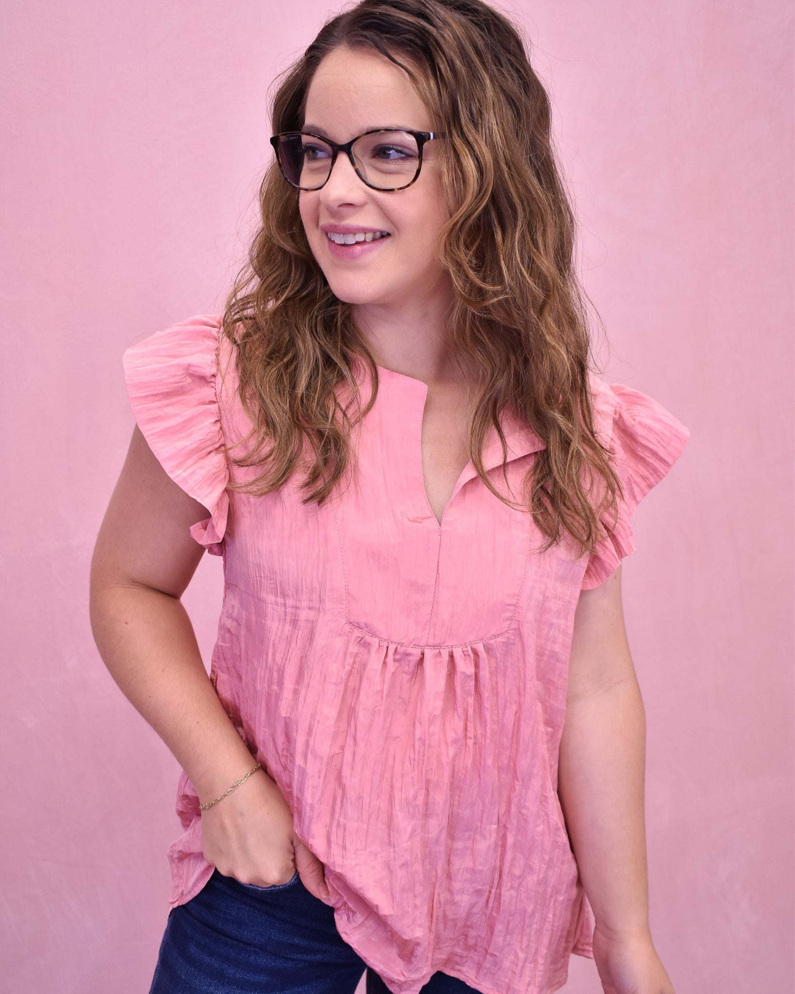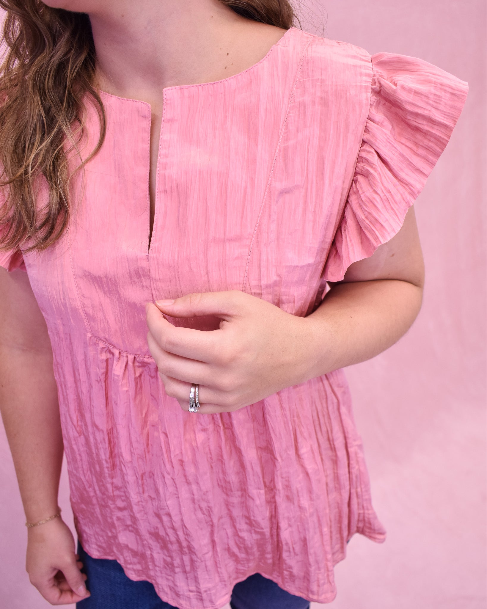 Elevate your wardrobe with the Skyline Chic Flutter Sleeve Top, crafted from soft crinkle fabric for effortless style and comfort. Its delicate flutter sleeves add a feminine touch, while the elegant split neck enhances breathability and sophistication. Perfect for day-to-night wear, this top combines trendy details with a flattering fit to keep you looking polished and confident.