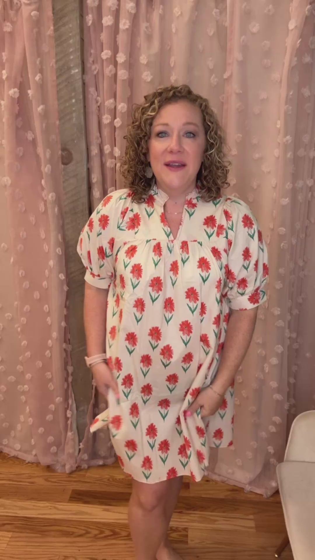 Take a sunset stroll in style with our floral mini dress! This dress features a charming ruffle neck and short puff sleeves. Perfect for a playful, lighthearted look. (Sunset not included.)