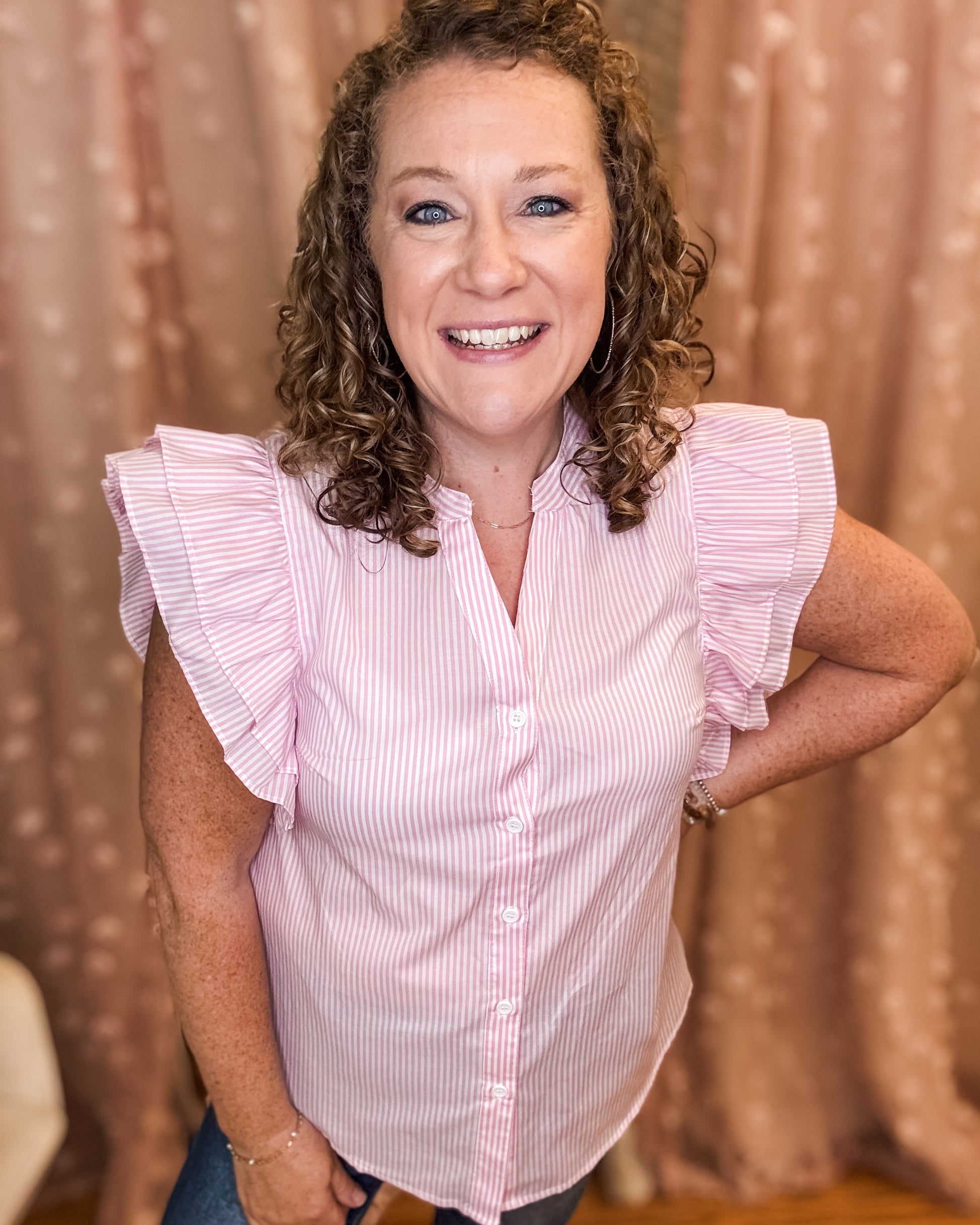 Embrace your inner sweetness with our striped ruffle top! This charming piece features a henley neckline for added flair and ruffle cap sleeves for a touch of playfulness. With its pink striped design, this top will add a pop of color to your wardrobe and make you feel effortlessly stylish. (Cue happy dance!).