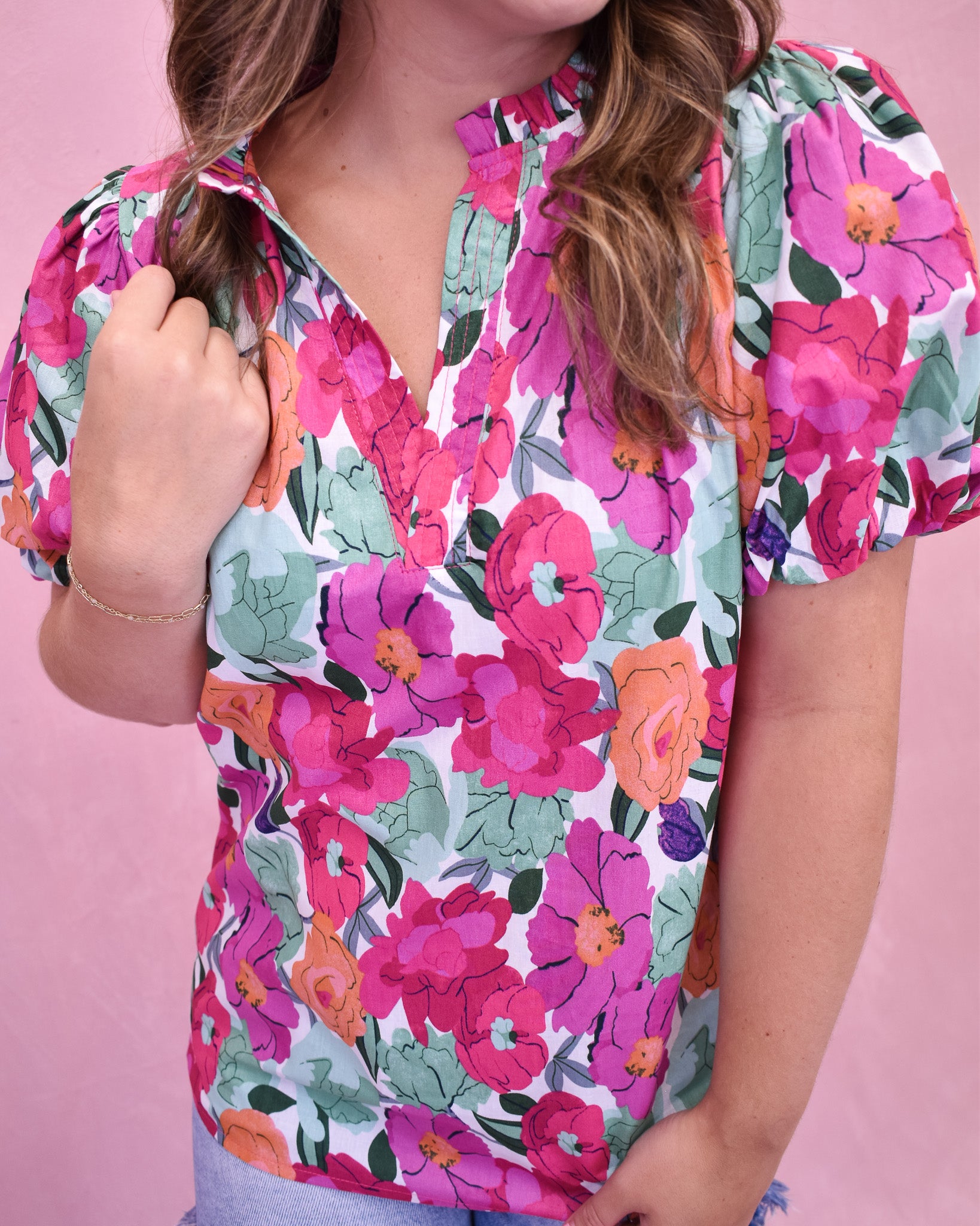 Elevate your wardrobe with the Through The Garden Puffed Sleeve Top, featuring a vibrant floral print that brings fresh energy to any outfit. Its split neckline adds a flattering touch, while puff sleeves and delicate ruffled details create a charming, feminine silhouette. Perfect for both casual days and special occasions, this blouse combines style and comfort effortlessly.